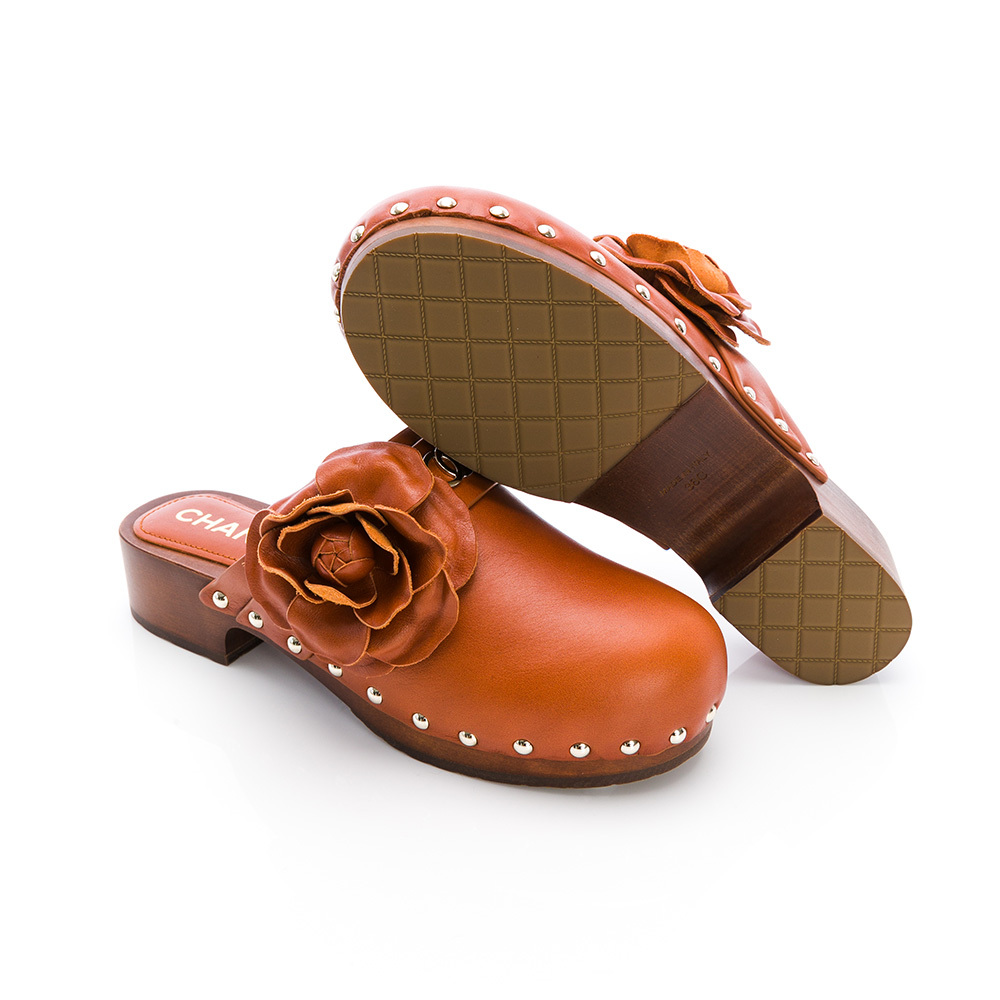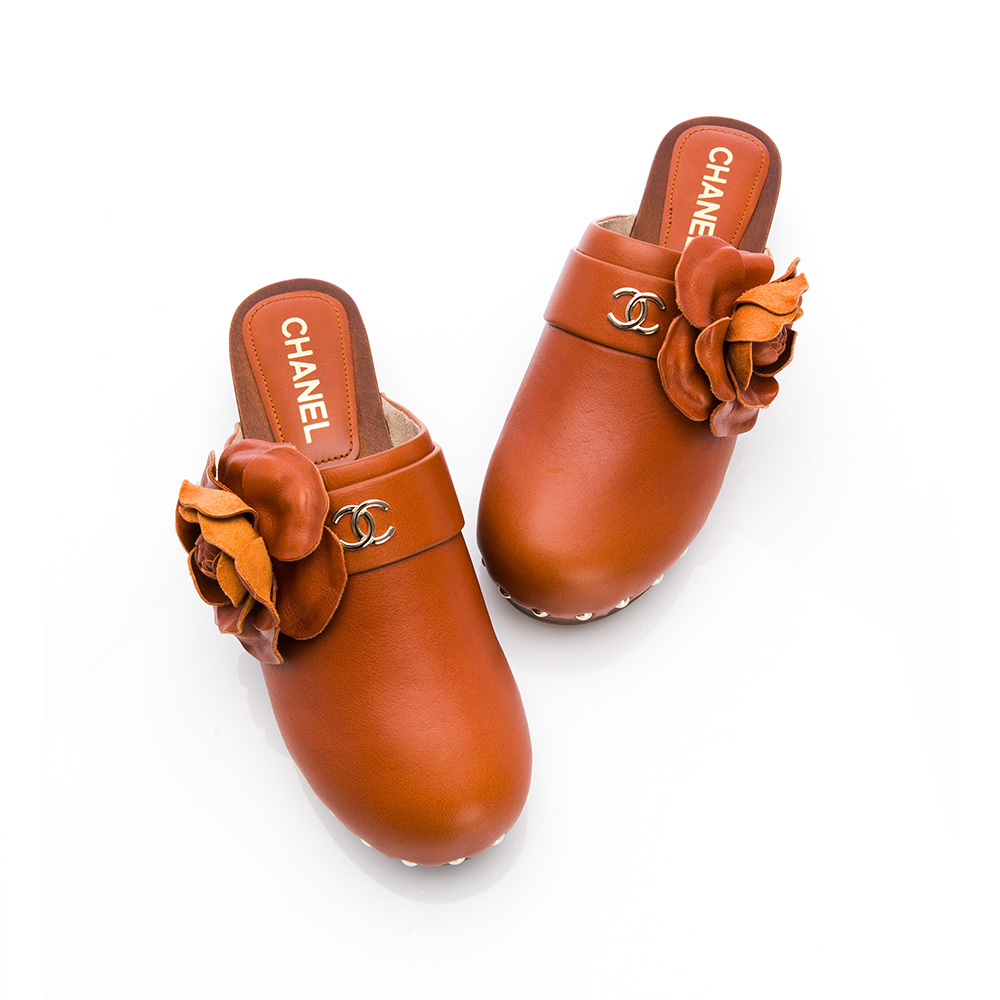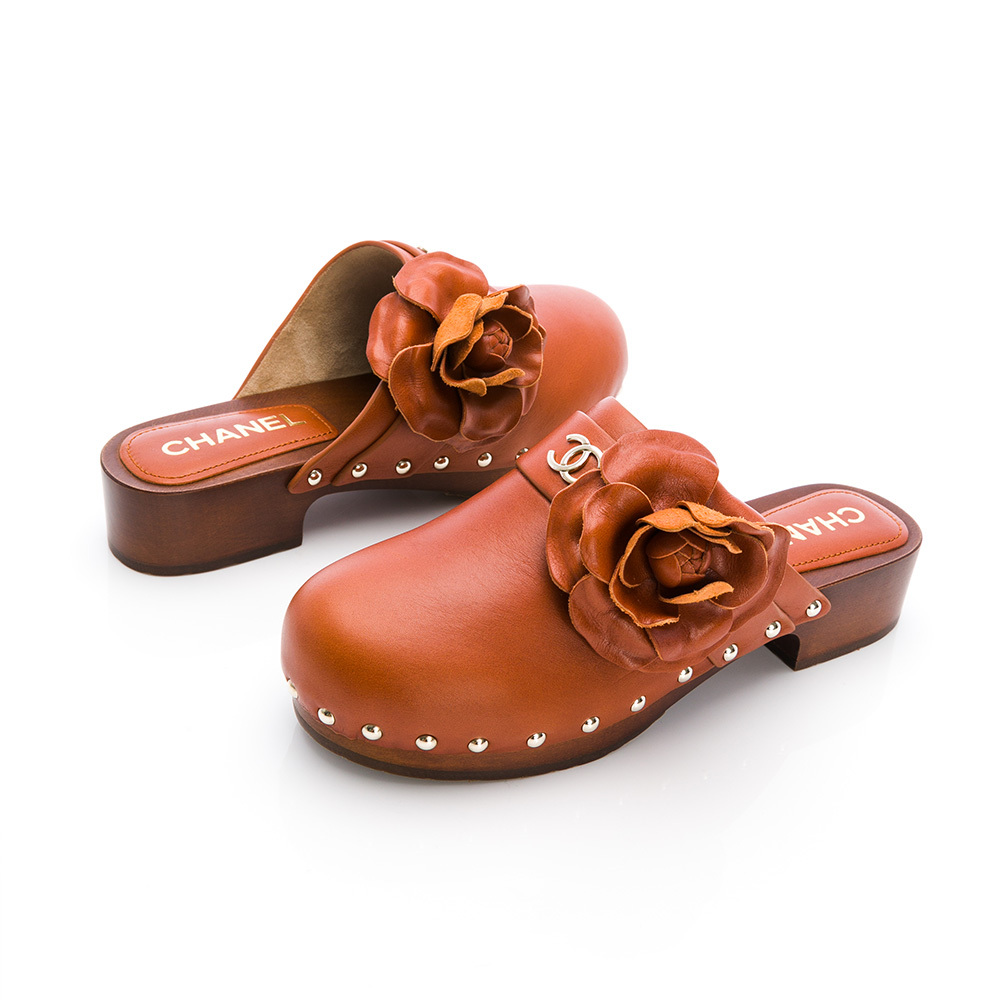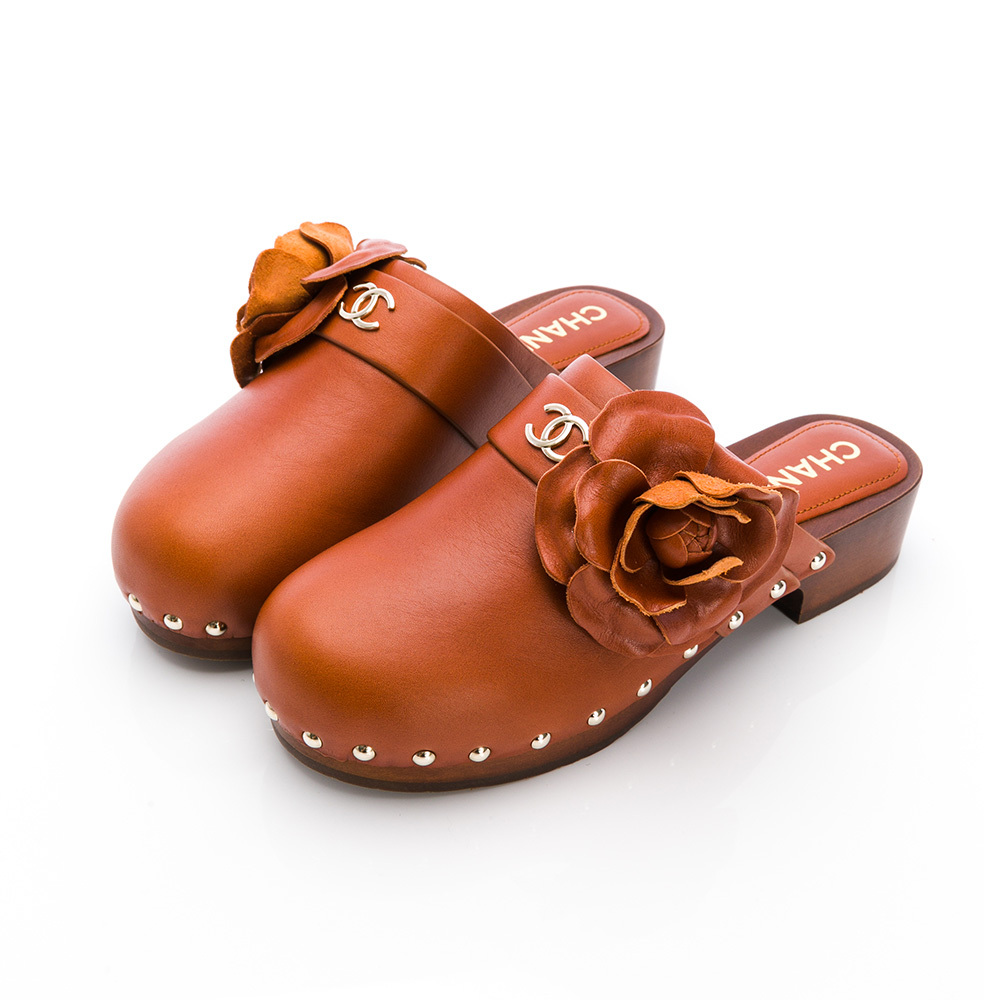 香奈兒小牛皮木屐,配上山茶花朵飾、標誌和飾釘。厚底木質鞋跟