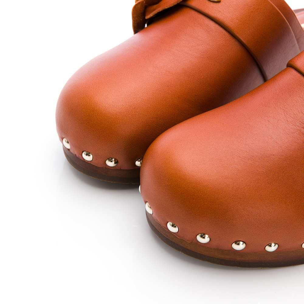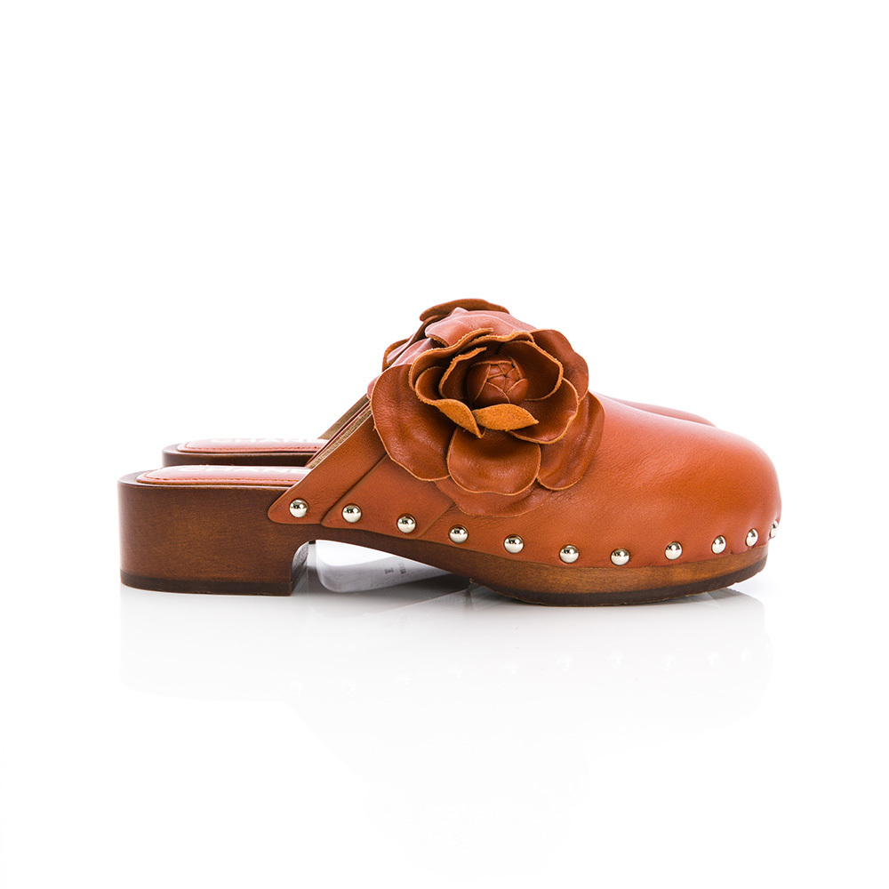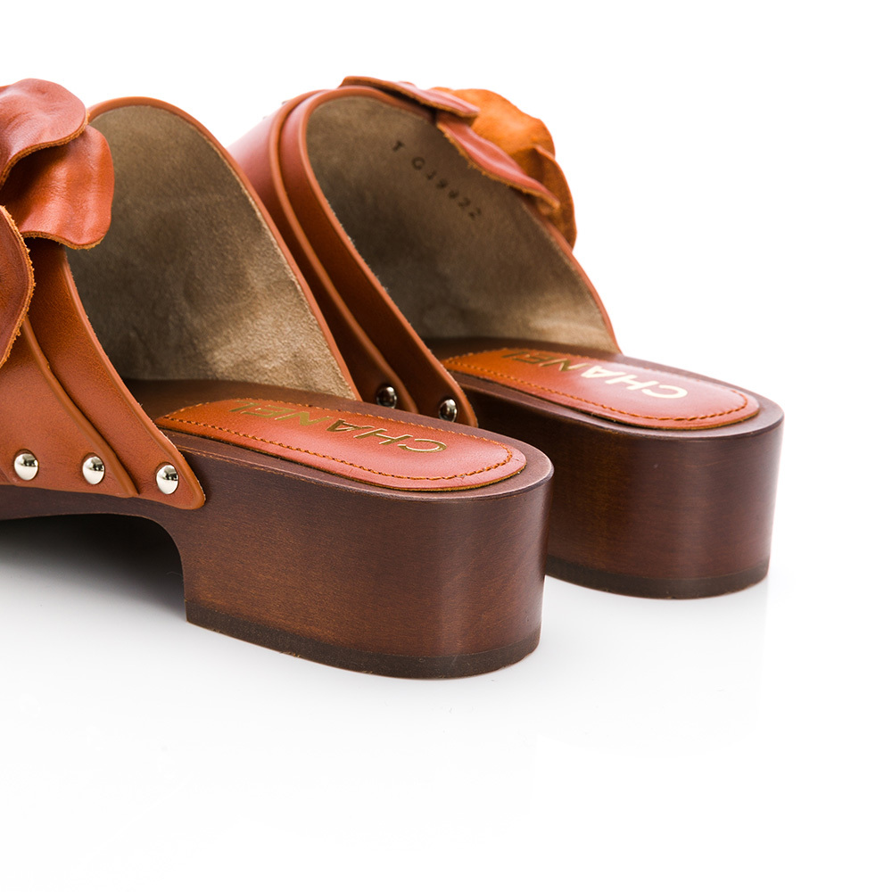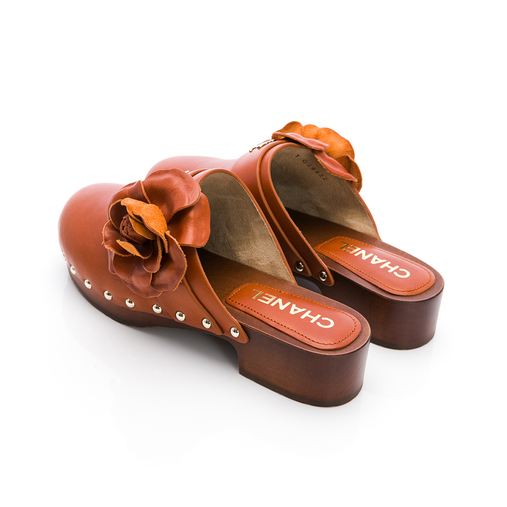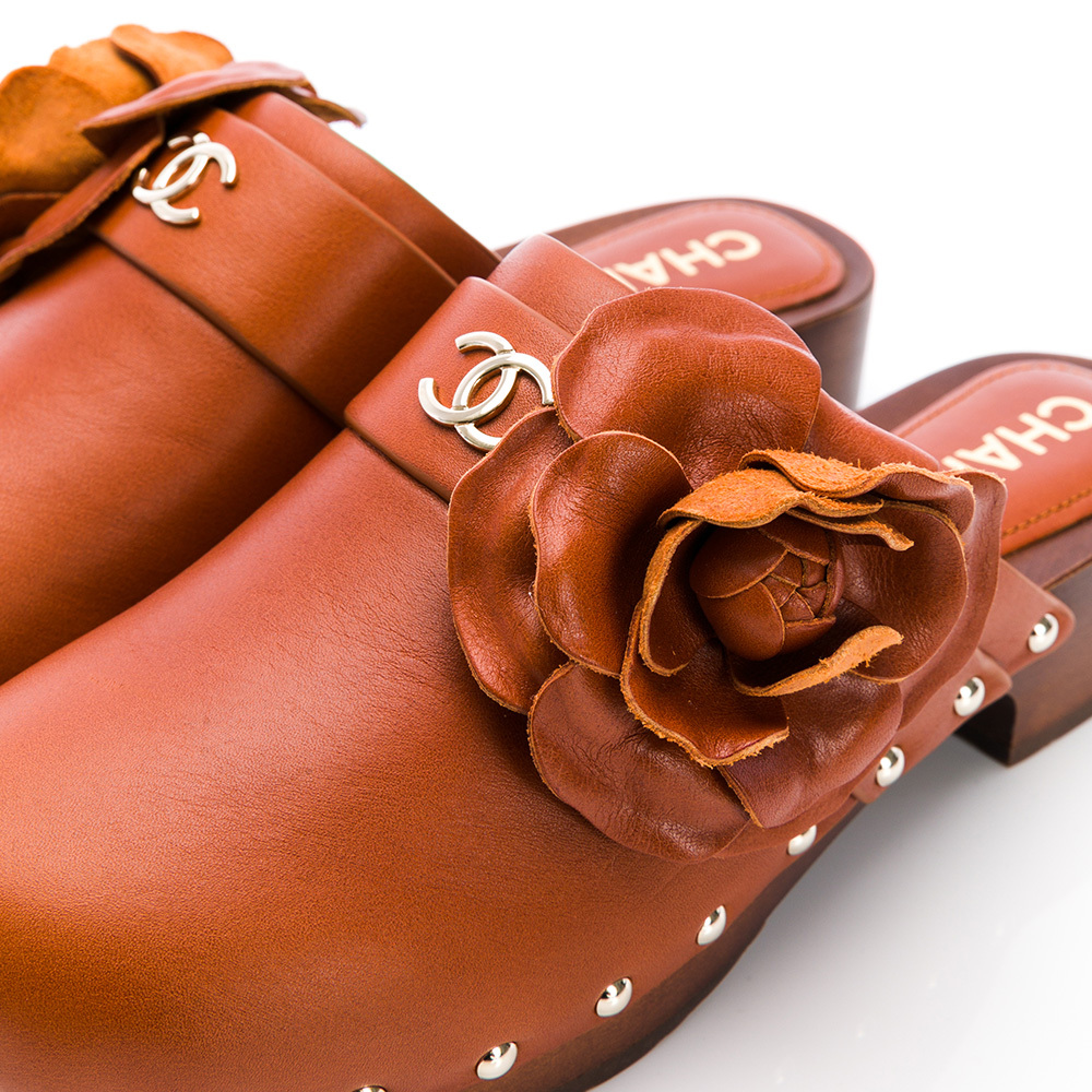 香奈兒小牛皮木屐,配上山茶花朵飾、標誌和飾釘。厚底木質鞋跟