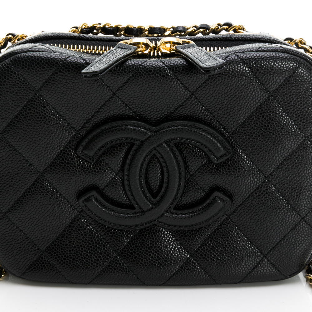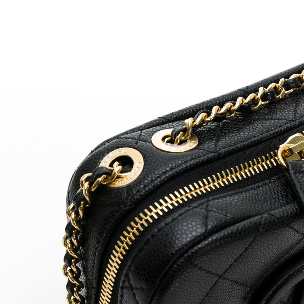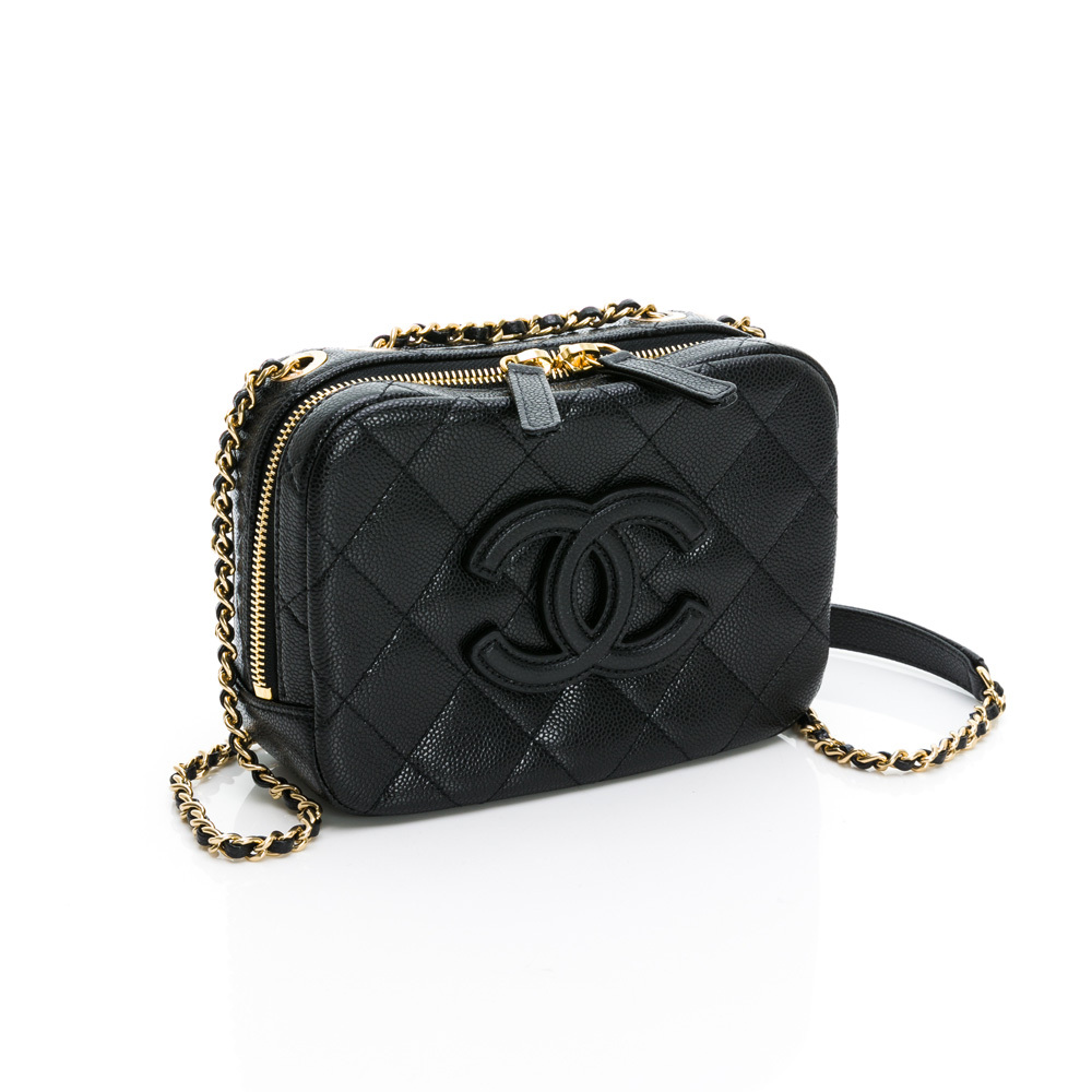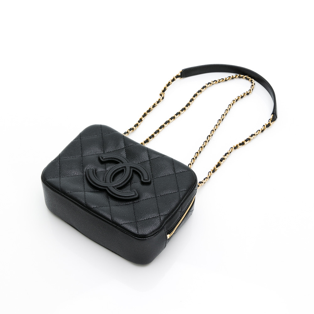 CHANEL 經典雙C LOGO菱格紋小牛皮鏈帶相機包/斜背包(黑色)