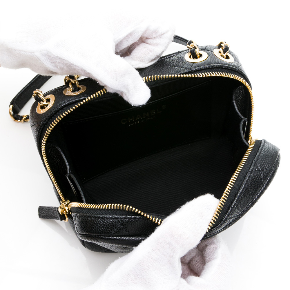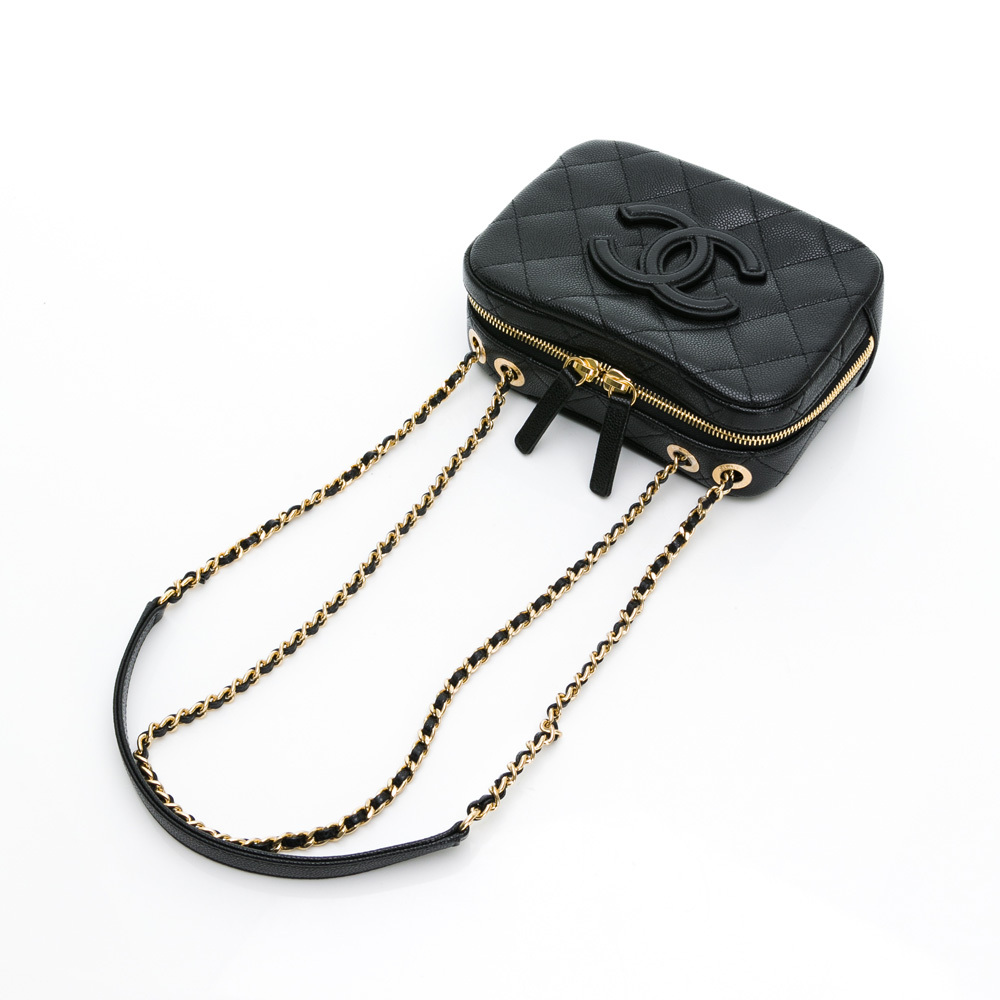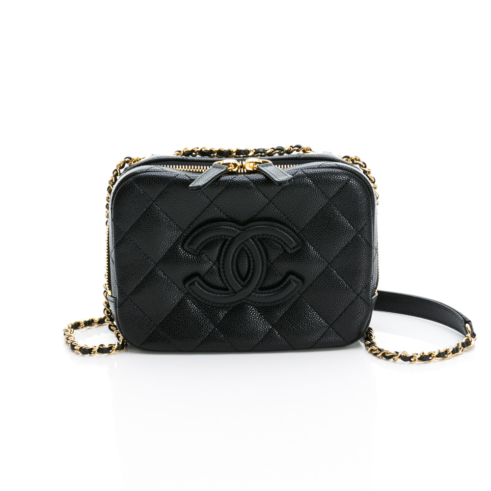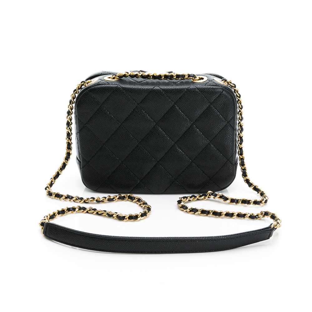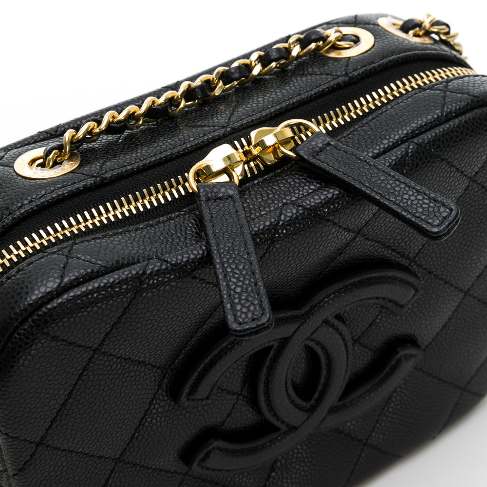 CHANEL 經典雙C LOGO菱格紋小牛皮鏈帶相機包/斜背包(黑色)