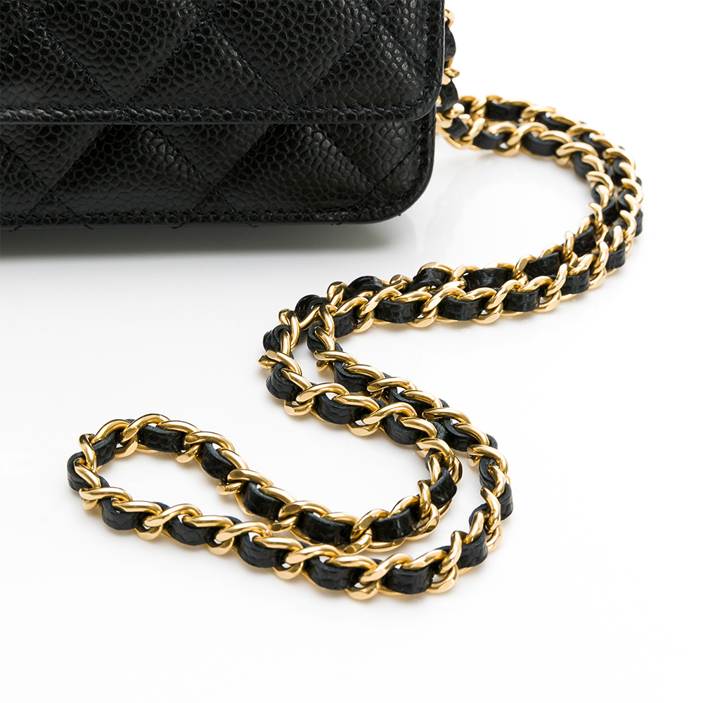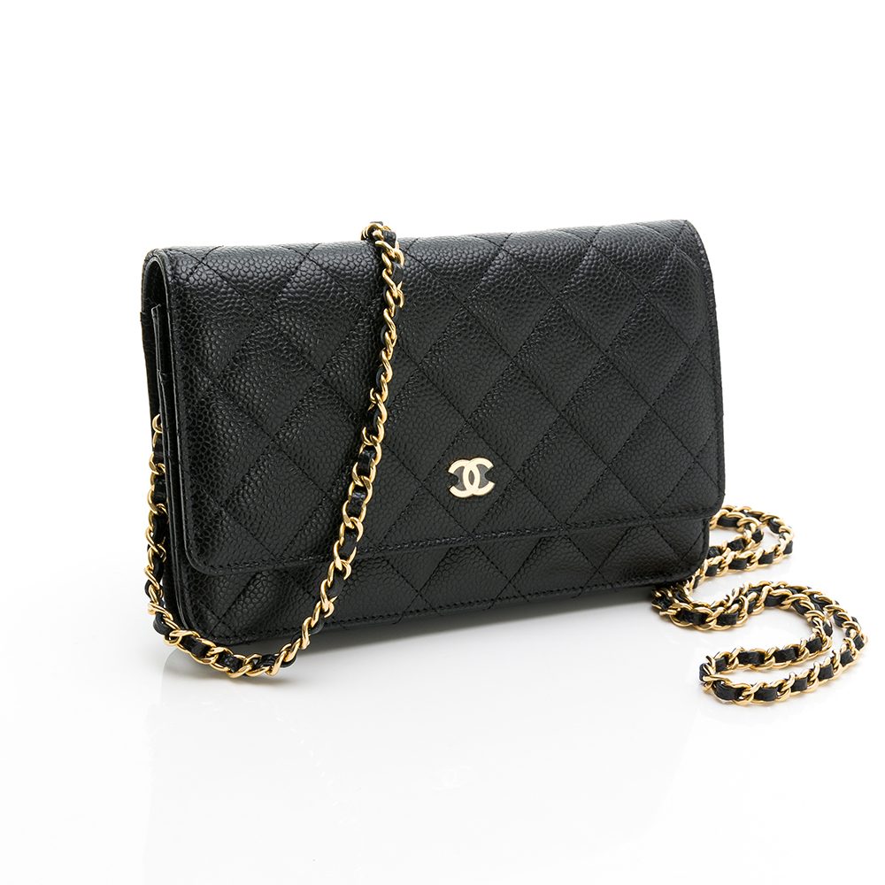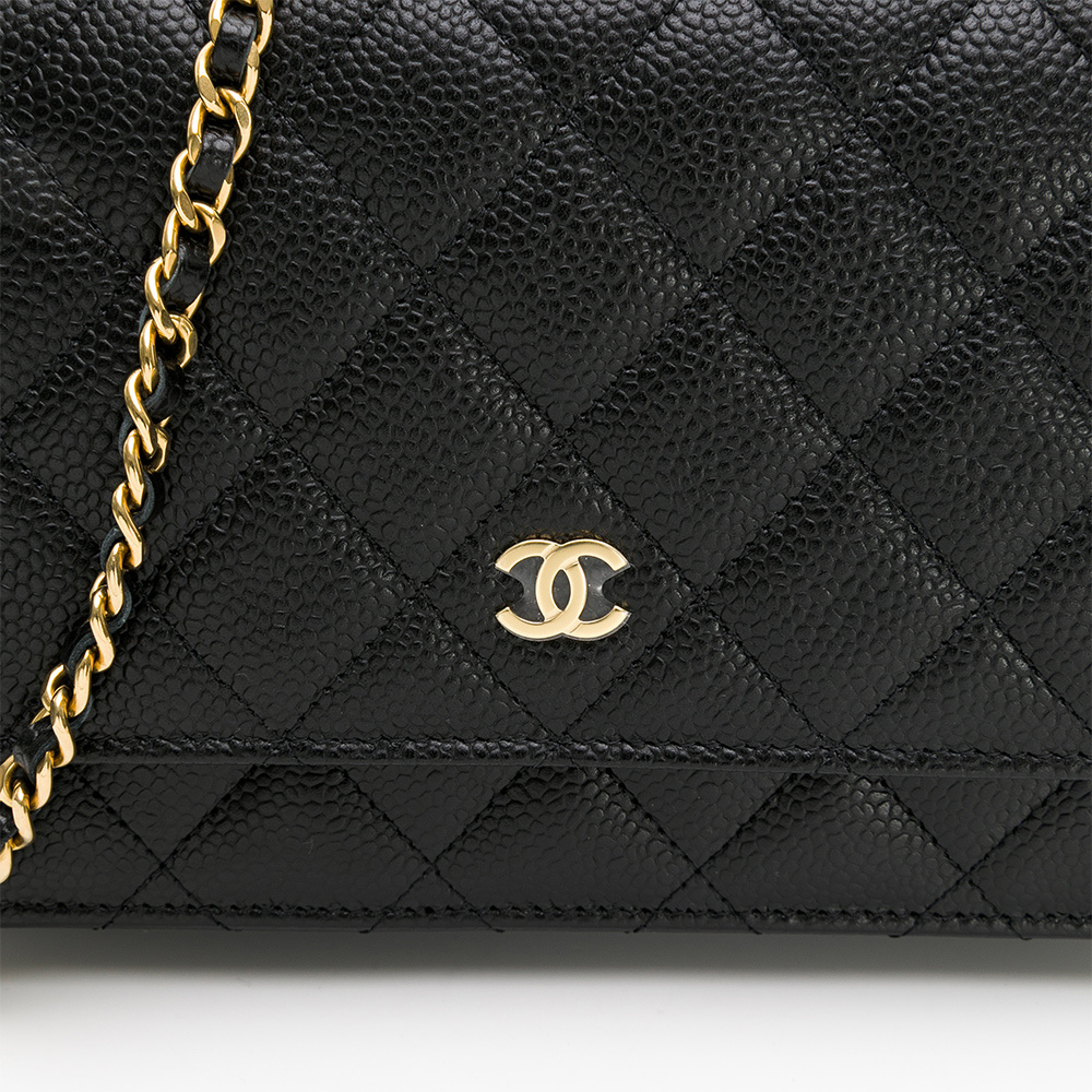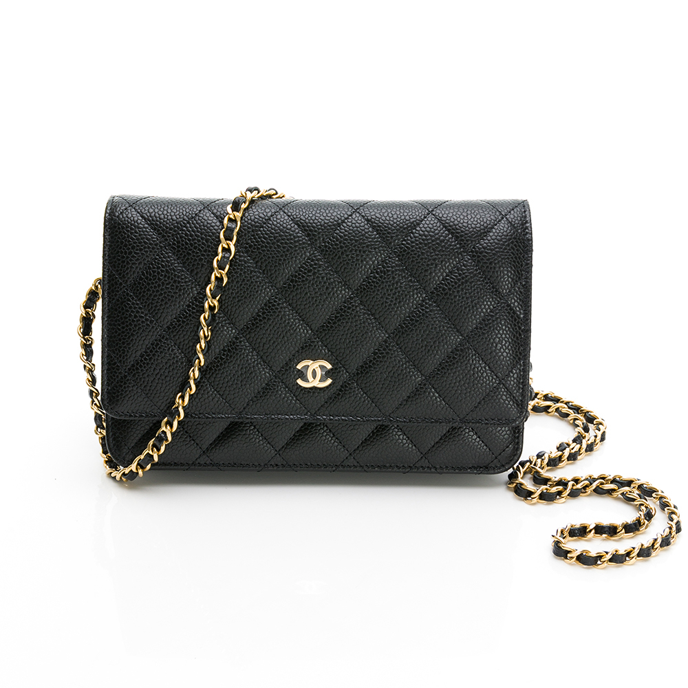 CHANEL 經典菱格紋牛皮WOC手拿/斜背包(黑金)