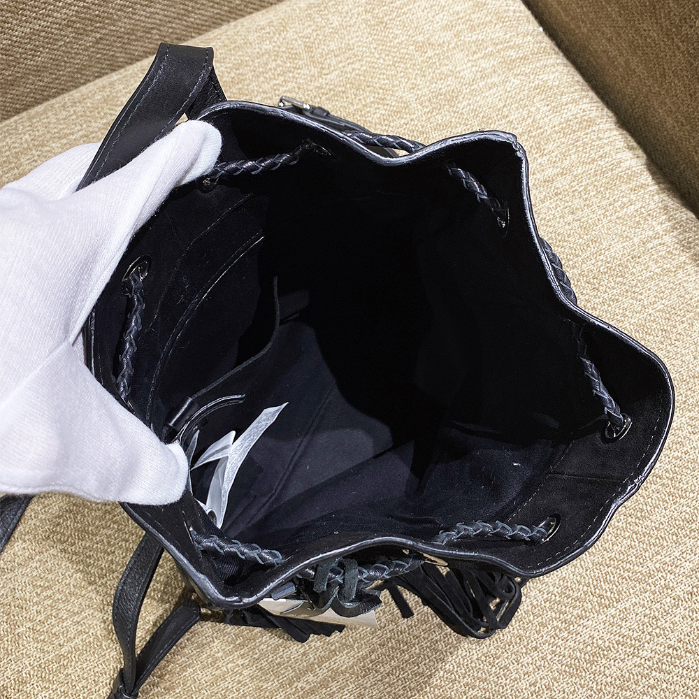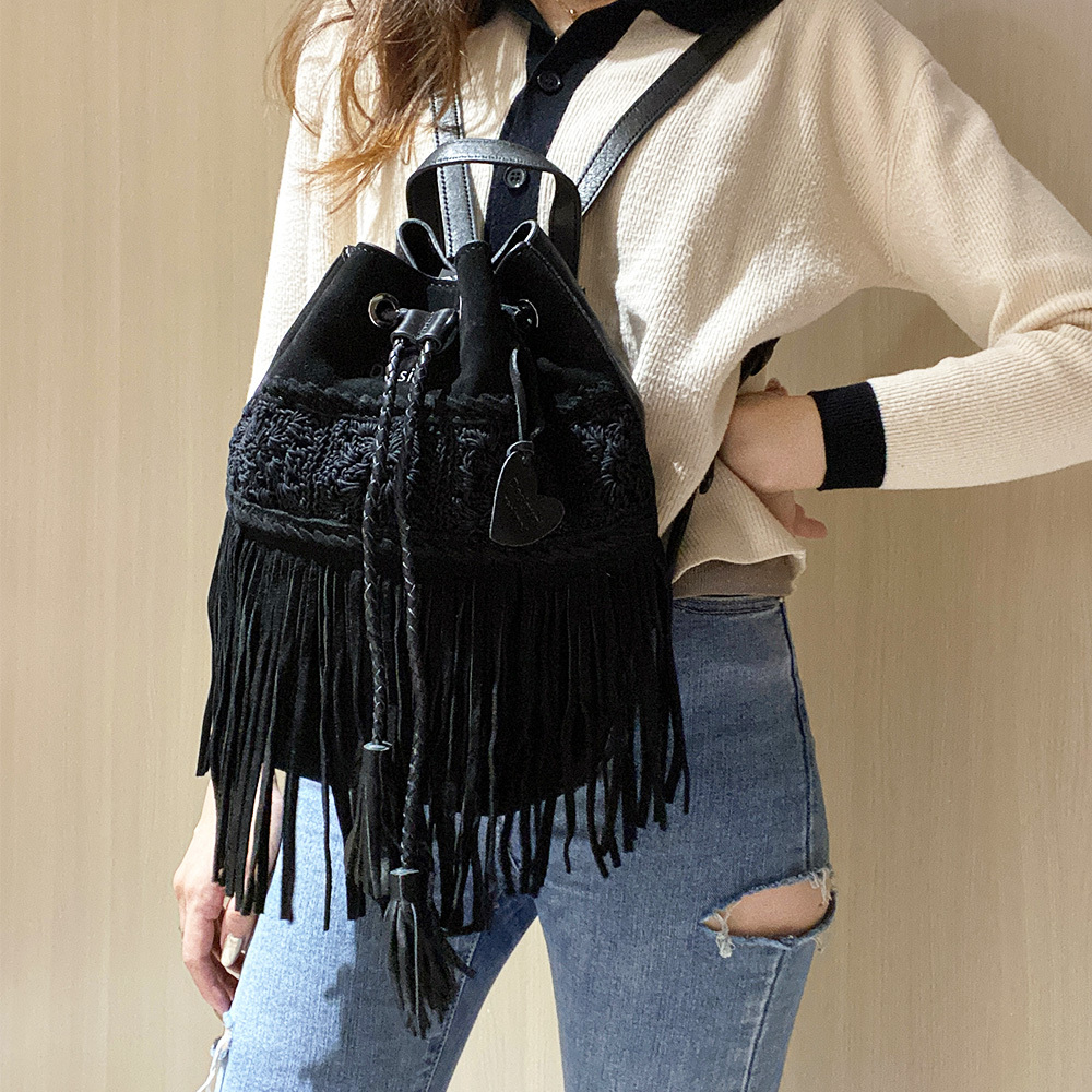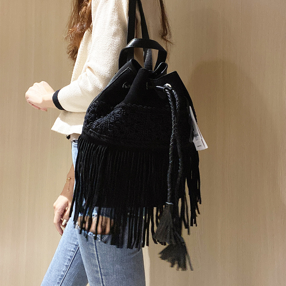 【微NG】Desigual 拼接皮革編織流蘇束口後背包(黑)