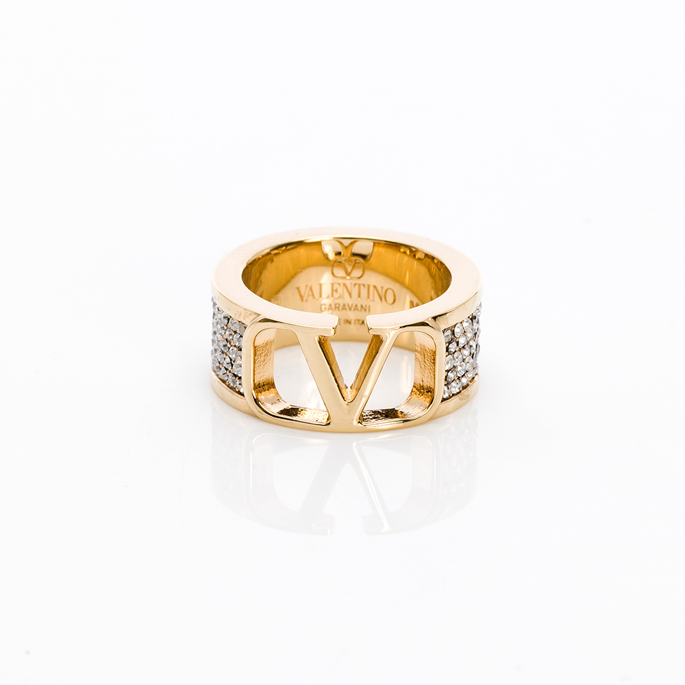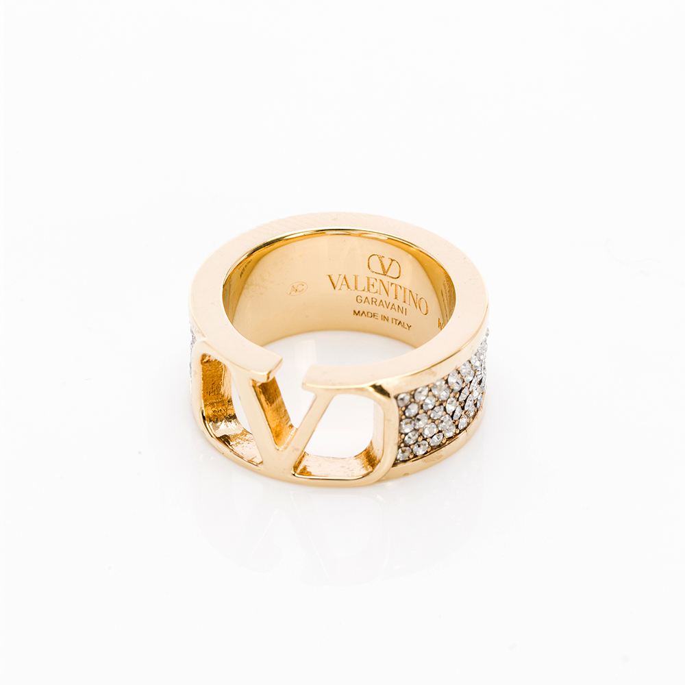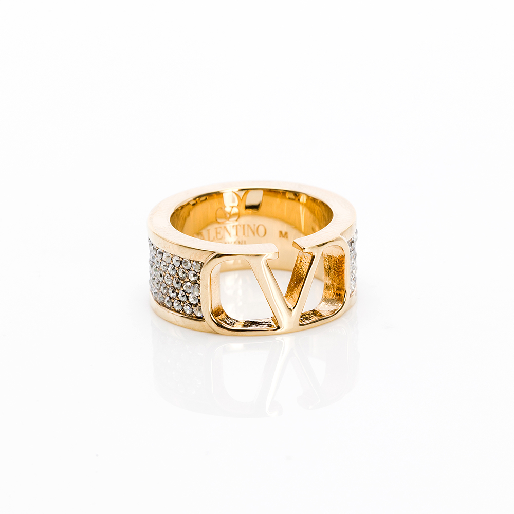這款粗戒指上鑲滿了耀眼的水晶,並帶有 VLOGO 字母組合,使您的服裝閃閃發光,風格獨特