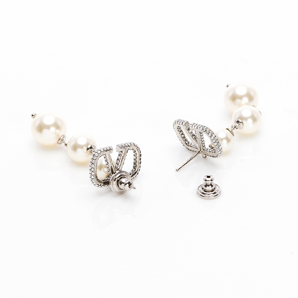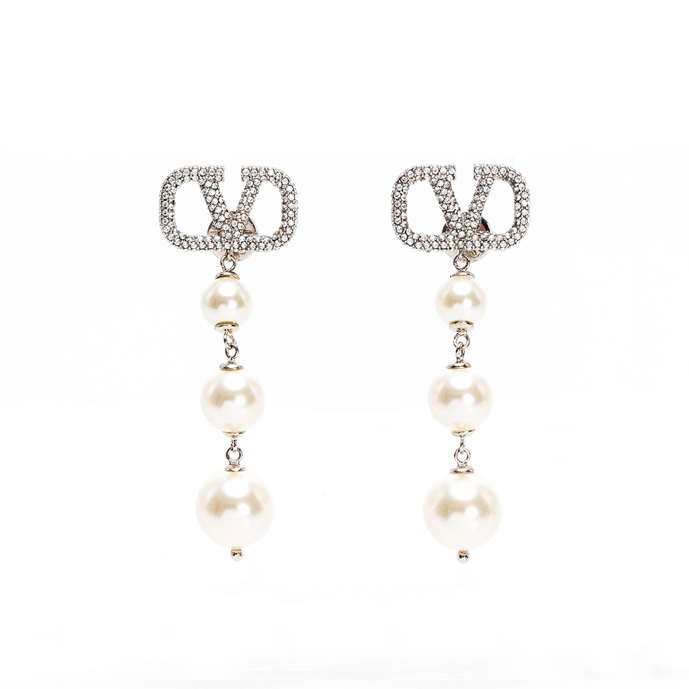 標誌性的 V 字標誌勾勒出閃閃發光的水晶輪廓,並懸掛著有光澤的仿珍珠